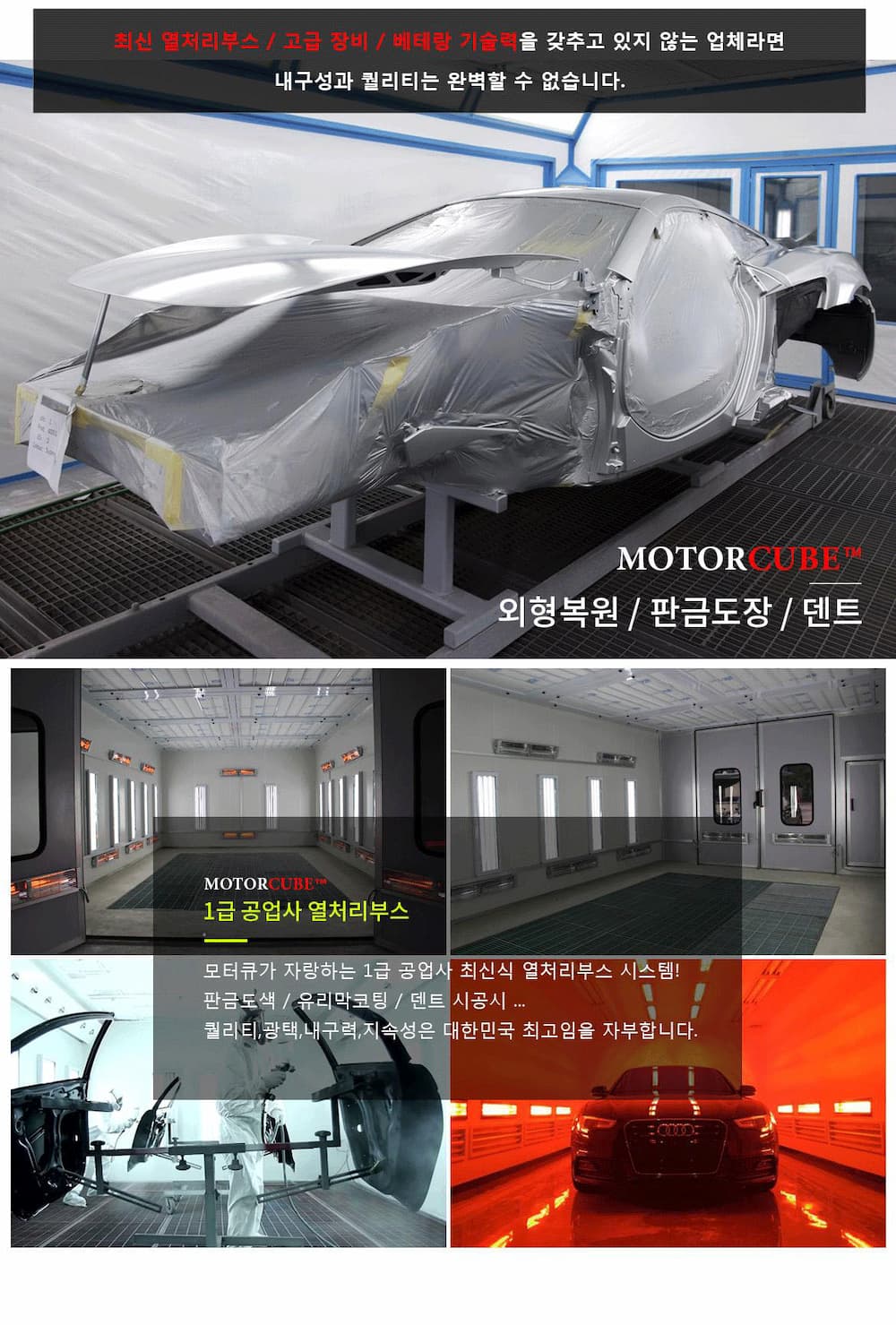 모터큐브는 1급 공업사 기준의 최신 열처리 도장 부스를 운영하고 있습니다.